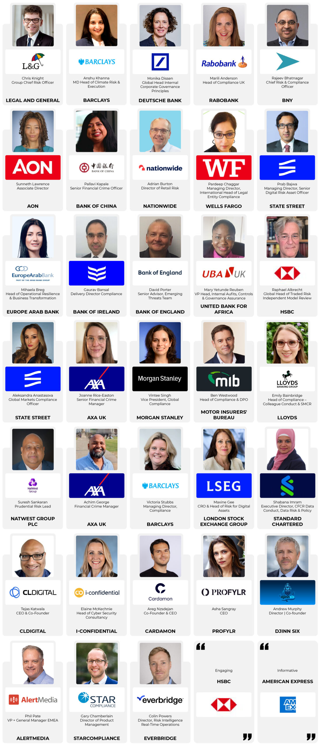 - 26+ Risk & Compliance professionals speaking from across financial service, our speaker faculty unites under one roof to share their experiences and insights
